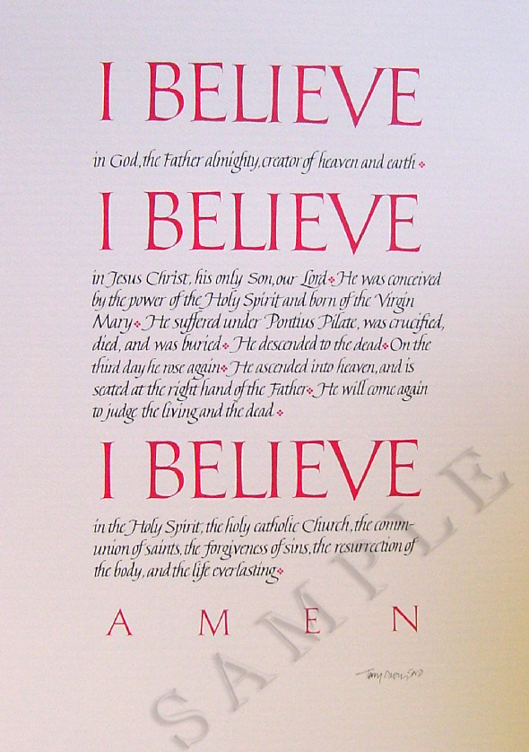 Color posters of the Apostle’s Creed calligraphied by Sister Terry Davis, SND, are available from the liturgy office of the Diocese of San José.