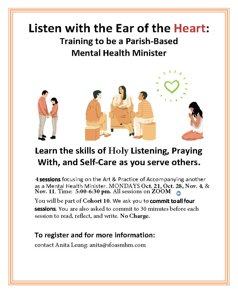 Learn skills to serve as a Parish-Based Mental Health Minister. Learn about If you or others in your parish are interested in Mental Health Ministry, take the first step in exploring and learn about Listen with the Ears of the Heart trainings by contacting Barbara Zahner at barbarazahner1.mac.com.