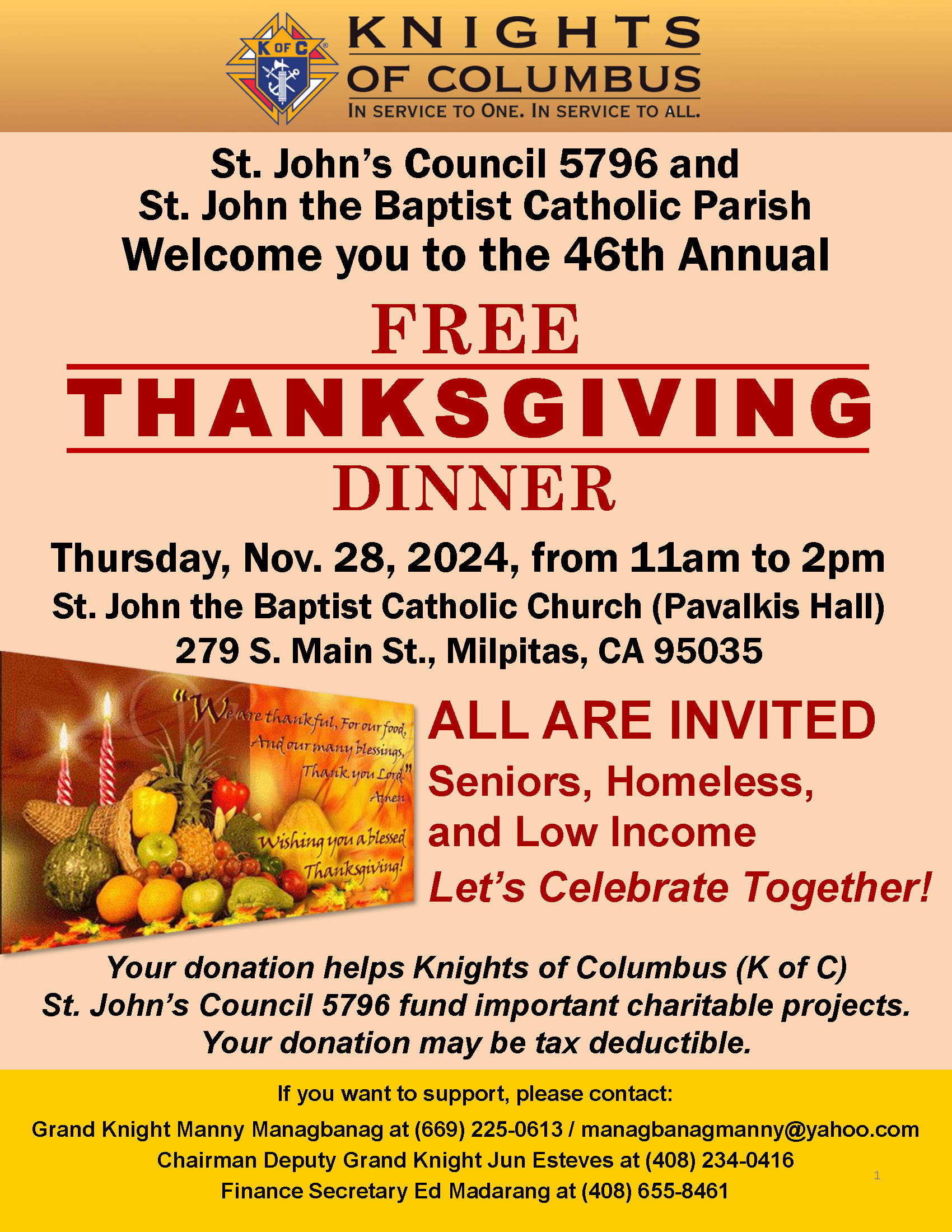 Thanksgiving 28 Nov 2024, from 11 am until 2 pm, Pavalkis Hall, St John the Baptist Parish, 279 s. Main St, Milpitas Ca. 95035. The Knights of Columbus Council 5796, will be serving a free Thanksgiving Dinner to those in need.