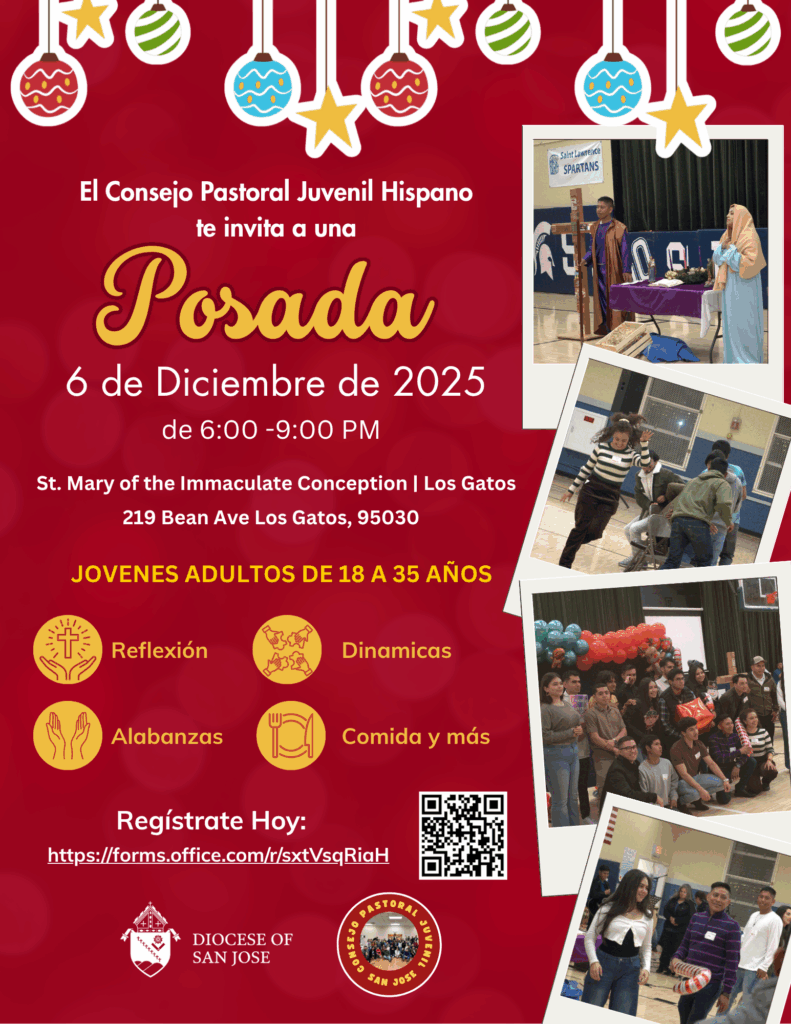 Dec 6 Posada Juvenil Join the Diocesan Posada for Young Adults! The Hispanic Youth Pastoral Council invites all young adults (ages 18–35) to celebrate the joy of Christ’s birth at our Posada Juvenil on Saturday, December 6, 2025, from 6–9 PM. There will be reflections, music, activities, food, and community with young adults from across the diocese in this Spanish speaking event.