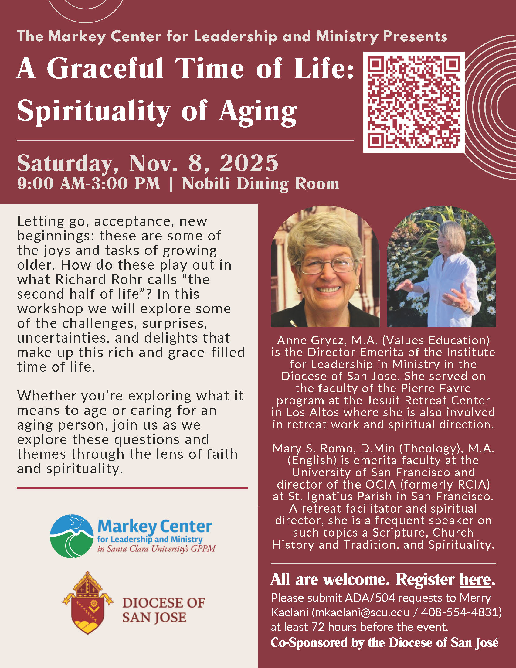 « All Events A Graceful Time of Life: Spirituality of Aging November 8 @ 9:00 am - 3:00 pm « National Vocations Awareness Week Plenary Indulgence OCIA Virtual Open Forum » Add to calendar Google Calendar iCalendar Outlook 365 Outlook Live Details Date: November 8 Time: 9:00 am - 3:00 pm Event Categories: Listening Session, Speakers, Workshop Venue Santa Clara University, Nobili Dining Room 500 El Camino Real Santa Clara, CA 95053 United States + Google Map Related Events OCIA Virtual Open Forum November 8 @ 10:00 am - 11:00 am 5 Week Young Adult Lenten Bible Study November 13 @ 7:00 pm - 8:30 pm Braiding Together – exploring and learning about Native American history and culture. November 17 @ 9:45 am - 11:00 am