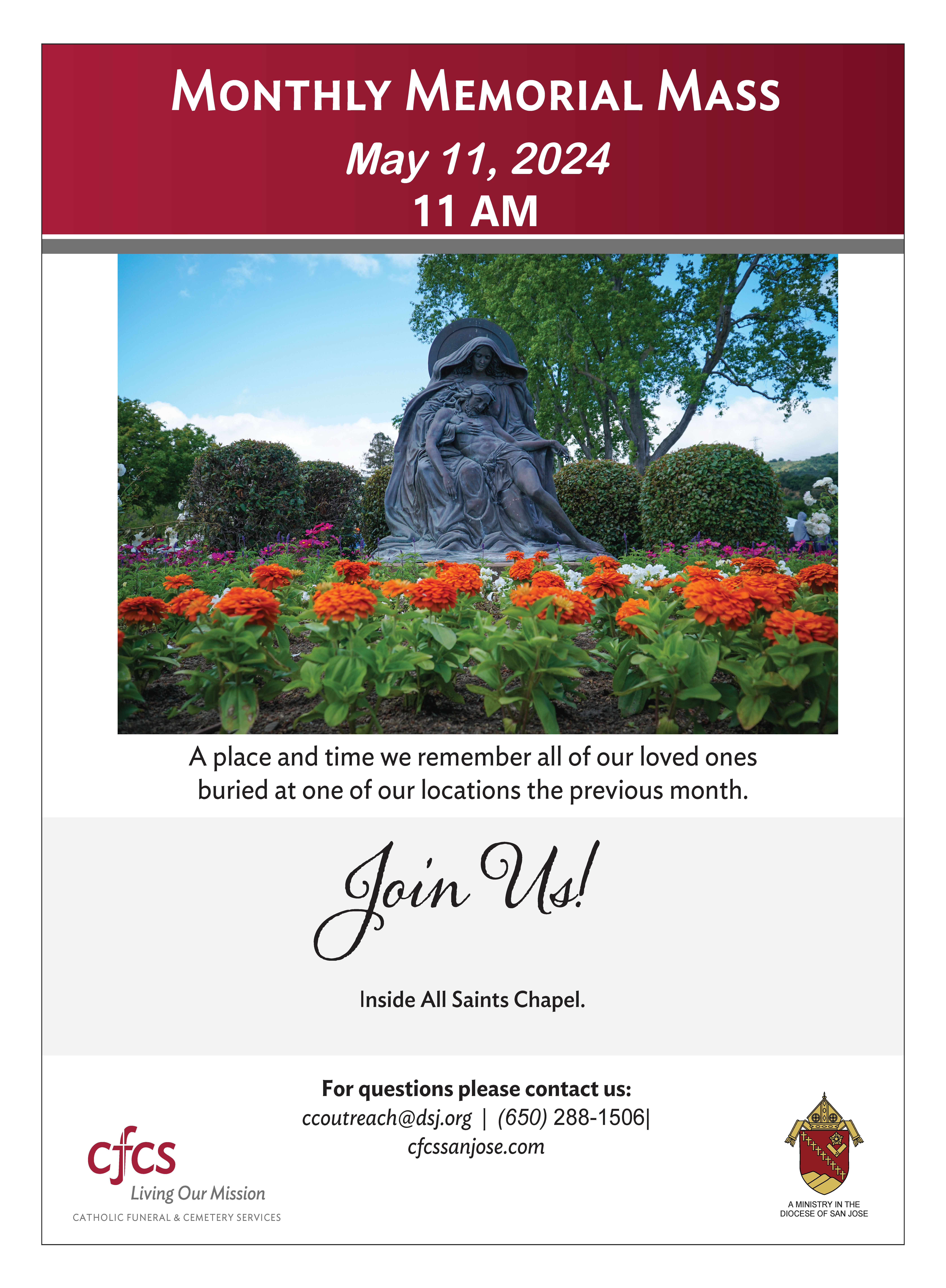 Mass will be held at 11:00 AM in the Saint Joseph Chapel at Calvary Catholic Cemetery 2650 Madden Ave, San Jose, CA 95116