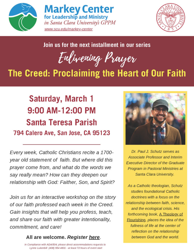 March 1, 9AM at Santa Teresa Parish join together for a workshop by Dr. Paul J. Schutz on The Creed: Proclaiming the Heart of Our Faith. This interactive workshop offered by the Santa Clara University Markey Center on the story of our Creed will help catechists, catechumens, and entire assemblies be more intentional in professing our faith! Click for information and share with friends and catechists. To RSVP click this SCU.edu link.