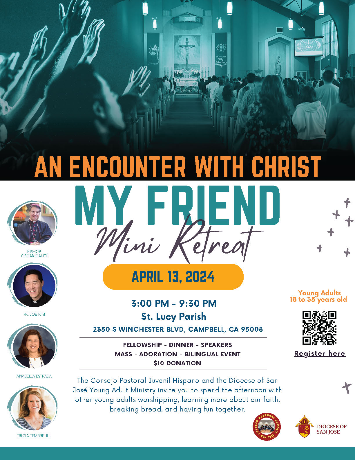 The Consejo Pastoral Juvenil Hispano and the Diocese of San José Youth Adult Ministry invite you to spend the afternoon with others young adults worshipping, learning more about our faith, breaking bread, and having fun together.