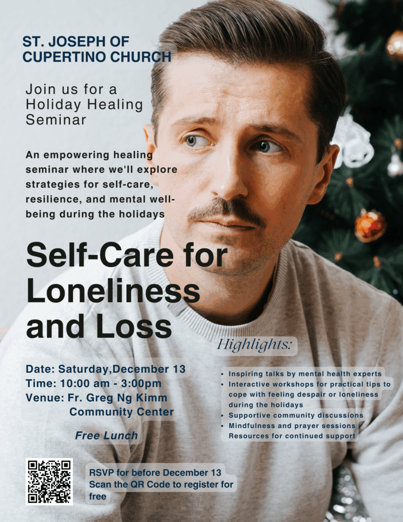 St. Joseph of Cupertino Parish is hosting a Holiday Healing Seminar to offer support for those experiencing loneliness, grief, or emotional heaviness during the holiday season. This event provides practical tools for well-being, guided reflection, mental-health insights, prayer, and community connection. Click here to register.