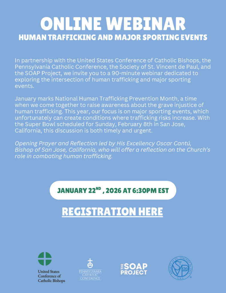 « All Events This event has passed. Human Trafficking Prevention Online Webinar January 22 @ 9:30 am - 10:30 pm « Braiding Together – exploring and learning about Native American history and culture. Walk for Life Mass 2026 » Add to calendar Google Calendar iCalendar Outlook 365 Outlook Live Details Date: January 22 Time: 9:30 am - 10:30 pm Event Category: Listening Session Venue Zoom Related Events Lent: A Divine conspiracy March 1 @ 5:00 pm - 6:00 pm Lenten Parish Mission “New Life in the Risen Christ” March 2 @ 8:30 am - 9:30 am Lenten Parish Mission “New Life in the Risen Christ” March 2 @ 6:30 pm - 8:30 pm
