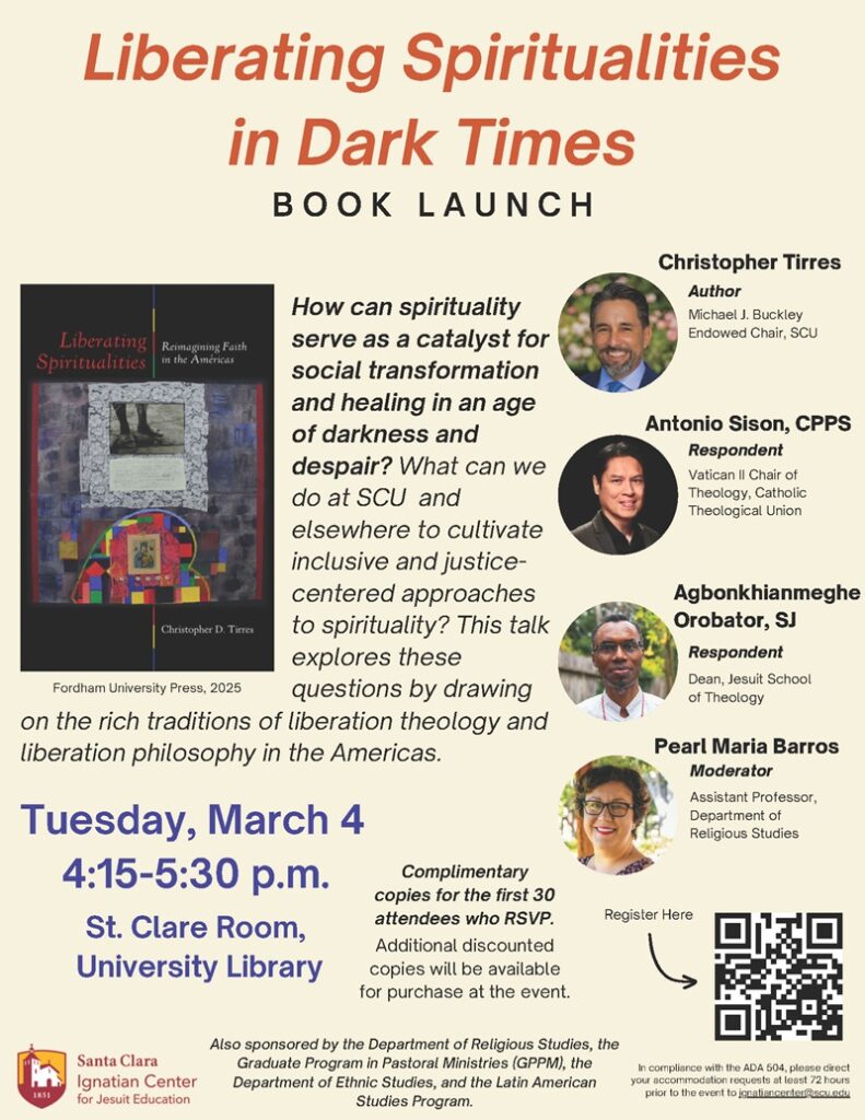 March 4, 2025, 4:15-5:30PM, Library and Learning Commons, Santa Clara University, Join the Bannan Forum for the launch of Liberating Spiritualities: Reimagining Faith in the Americas by Christopher Tirres, Michael J. Buckley Endowed Chair in the Department of Religious Studies at Santa Clara University.