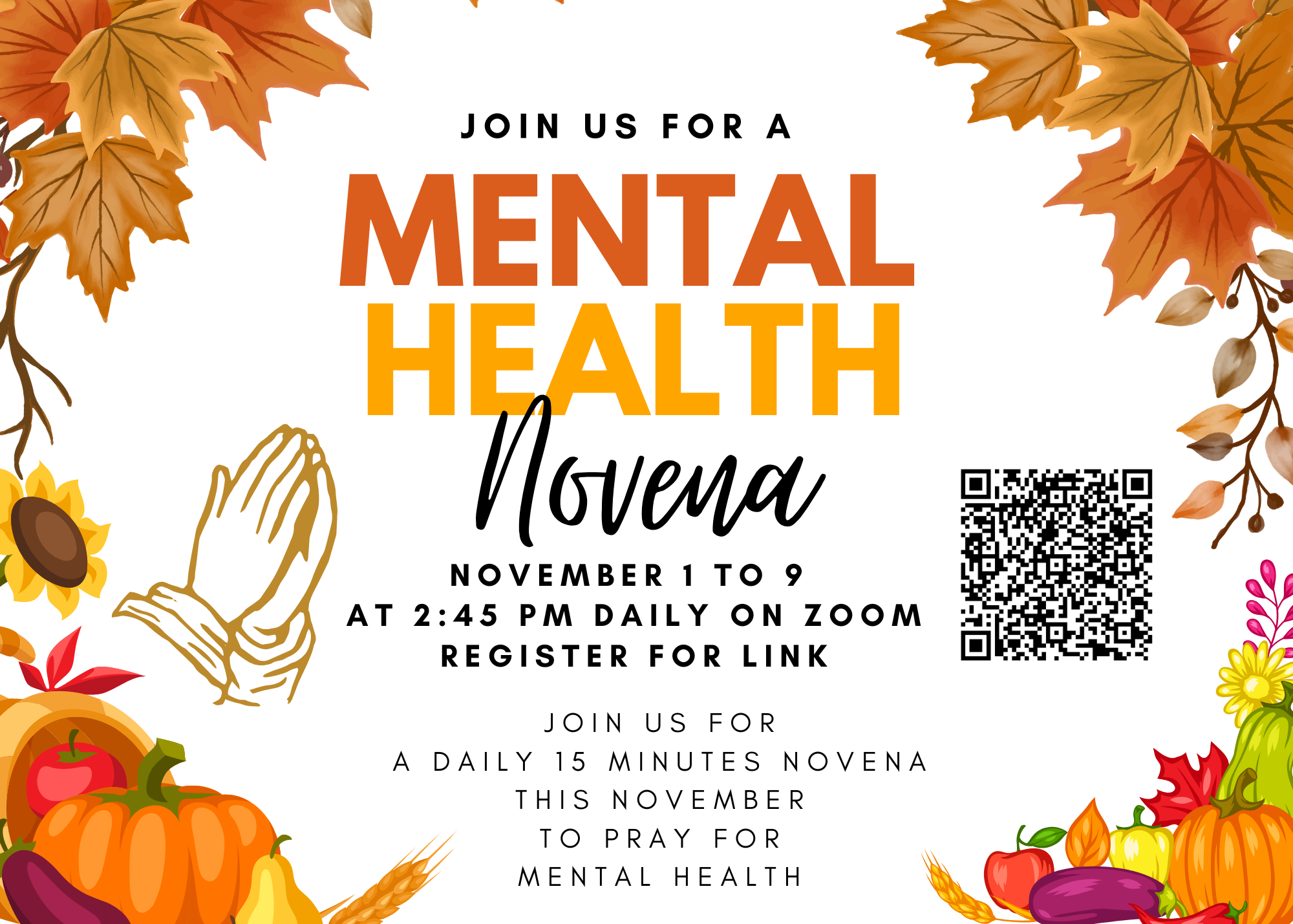 Join us for a nine-day novena for Mental Health. Each day from November 1 to November 9 at 2:45 pm PT, we will meet on Zoom to say the National Catholic Mental Health Campaign Novena Mental Health.