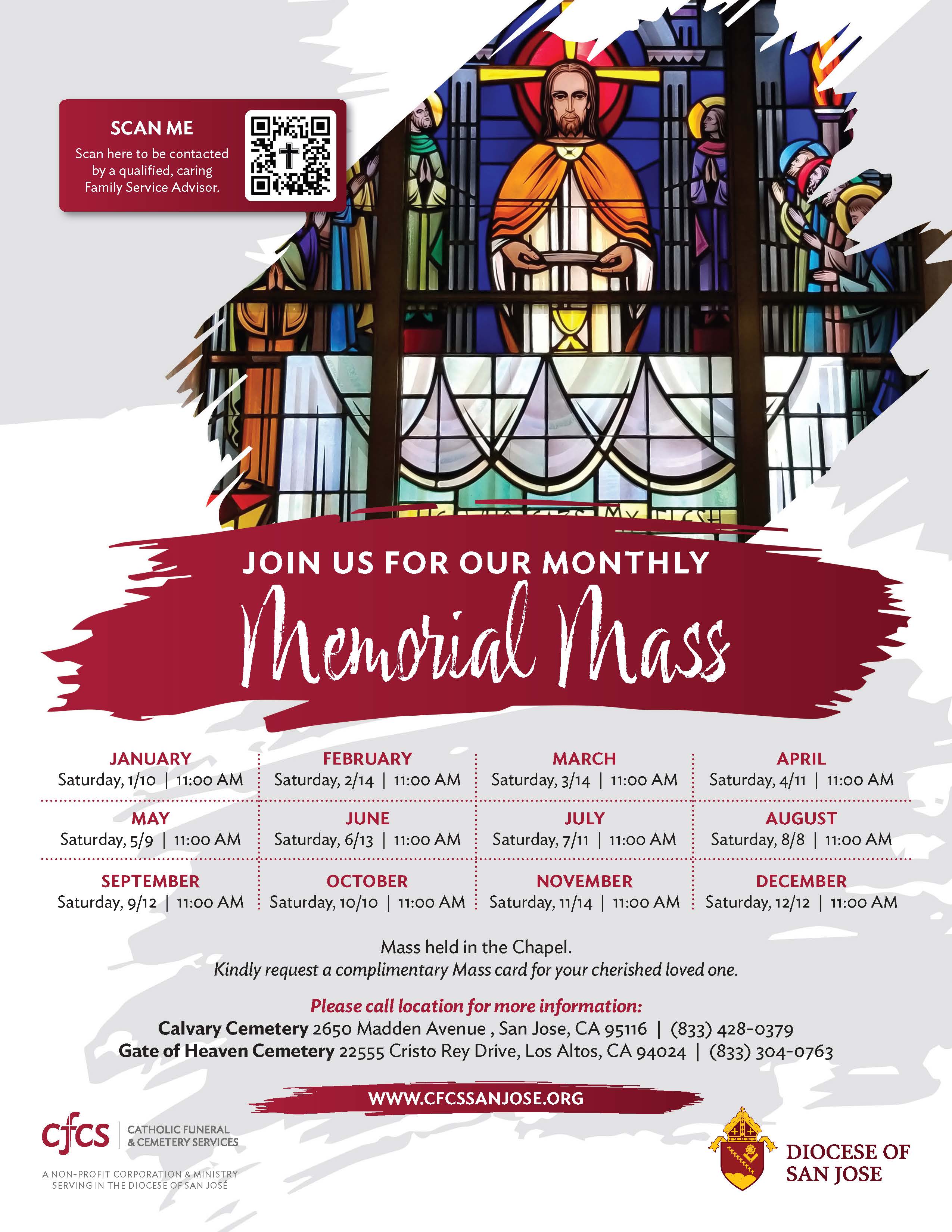 - Calvary Cemetery,11:00 AM, held at 2650 Madden Avenue, San Jose, CA 95116.