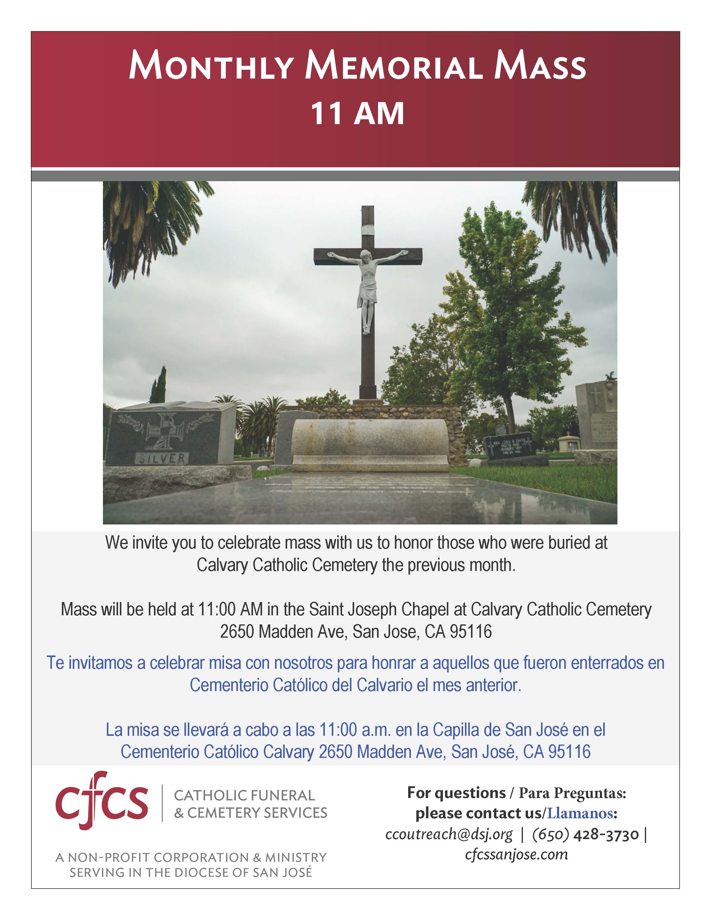 Monthly Memorial Mass Calvary Cemetery, 11/9, 11AM-12PM, 2650 Madden Ave, SJ. This is a time when we remember those who have died in the month of October. If you would like to add a loved one’s name for an anniversary or birthday, please email ccoutreach@dsj.org.