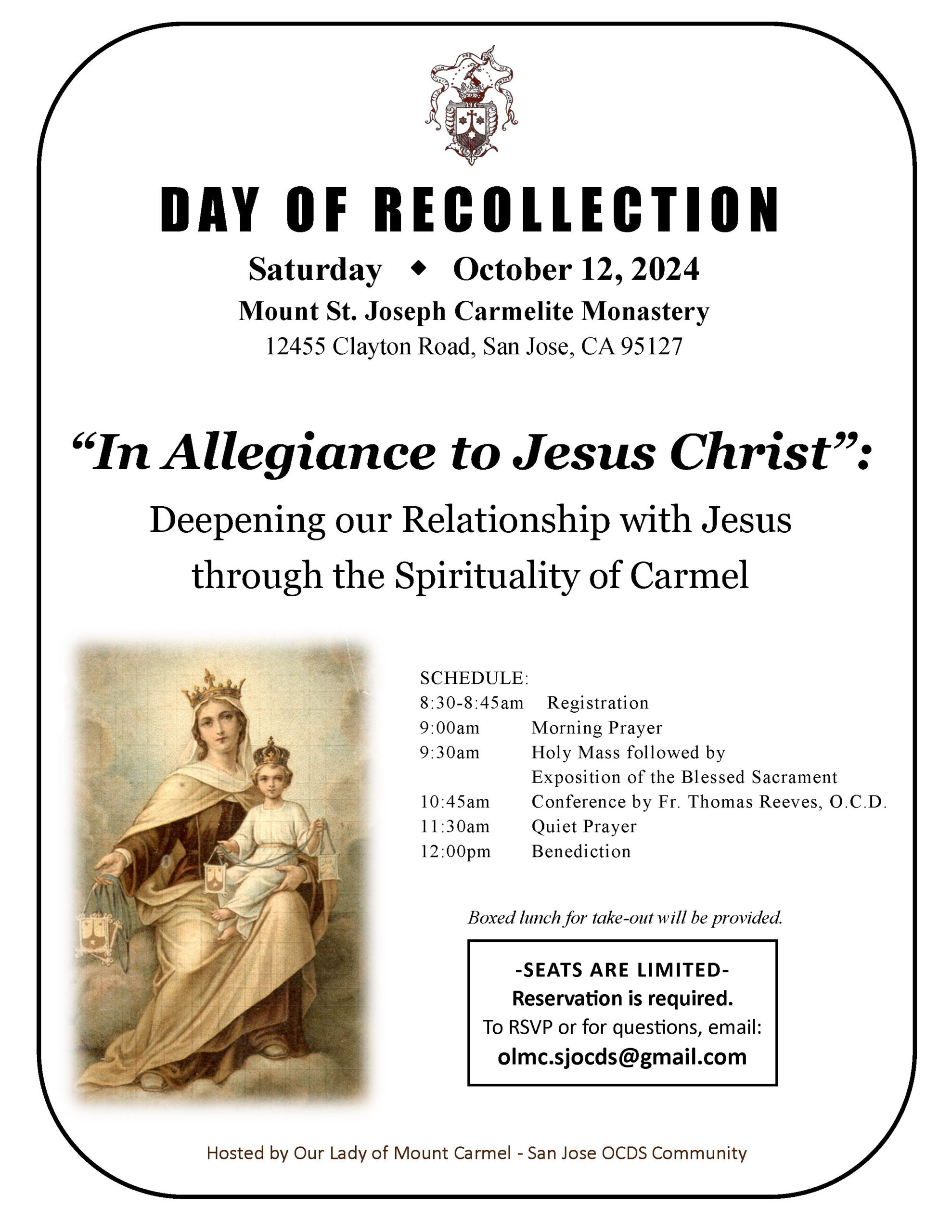 Morning of Recollection “In Allegiance to Jesus Christ: Deepening our Relationship with Jesus through the Spirituality of Carmel”, 10/12/24, 8:30am-noon, Mount St. Joseph Carmelite Monastery (12455 Clayton Road, San Jose), Hosted by SJ Carmelite Secular Community. Seats are limited, reservations required. Morning prayer, Holy Mass, Exposition, Conference by Carmelite Prior Fr. Thomas Reeves, Quiet Prayer, Benediction, boxed lunch. Reserve your seat at olmc.sjocds@gmail.com.
