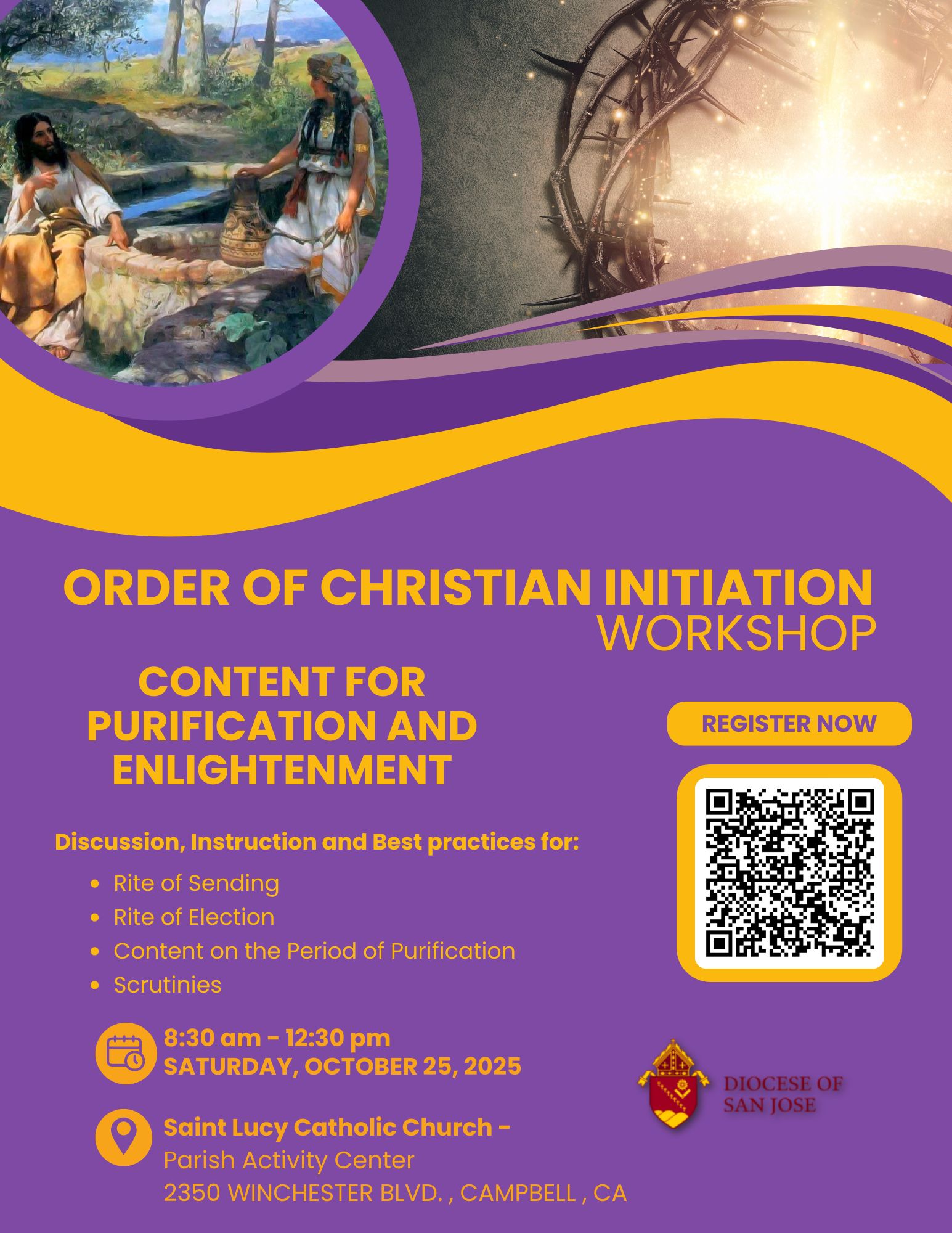 The Diocesan Catechumenate Committee is hosting an Order of Christian Initiation (OCIA) Workshop on the Period of Purification and Enlightenment. Saturday, October 25, 2025 – from: 8:30 AM to 12:30 PM at Saint Lucy Catholic Church – Parish Activity Center 2350 Winchester Blvd., Campbell. Click here for the flyer. Registration is now open!