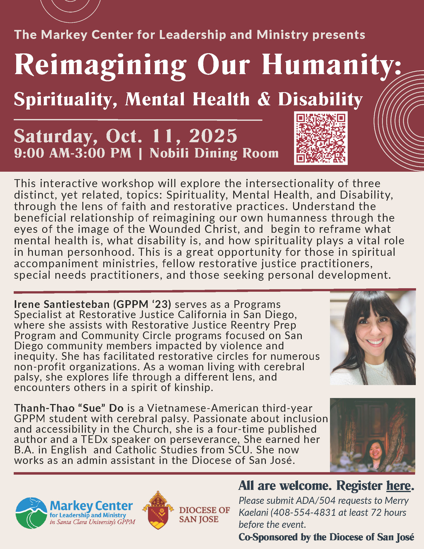 « All Events This event has passed. Reimagining Our Humanity: Spirituality, Mental Health & Disability October 11 @ 9:30 am - 3:00 pm « Evening with Mary “Blessed Mother Mary, Model for All Pilgrims of HOPE” Adult Confirmation » Add to calendar Google Calendar iCalendar Outlook 365 Outlook Live Details Date: October 11 Time: 9:30 am - 3:00 pm Event Categories: Speakers, Workshop Venue Santa Clara University, Nobili Dining Room 500 El Camino Real Santa Clara, CA 95053 United States + Google Map Related Events Advent Parish Mission December 9 @ 8:00 am - 9:00 am Advent Parish Mission December 9 @ 6:15 pm - 8:00 pm Advent Parish Mission December 10 @ 6:00 pm - 8:00 pm