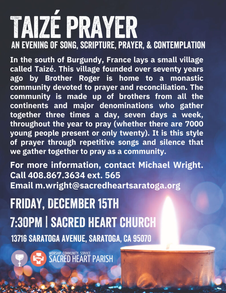 Join us for our Taizé Prayer. Taizé Prayer is a chant based, meditative, candle-lit service that centers around music, prayer, and silence to quiet the mind, open the heart and feed the soul. The prayer consists of resting in God and of allowing ourselves to be caught up in God’s mysterious and abiding love within.
