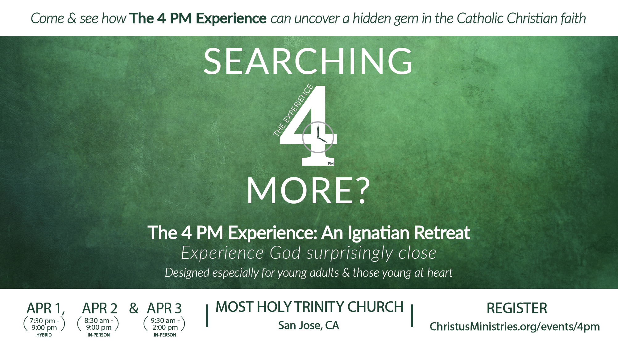 Are you a young adult, or young-at-heart, searching for more? Come and experience this unique parish-based retreat. Bring a sense of curiosity and wonder to encounter a God who is surprisingly close, real, and personal, in the context of a meaningful and inspiring community. The retreat is based in Ignatian spirituality.