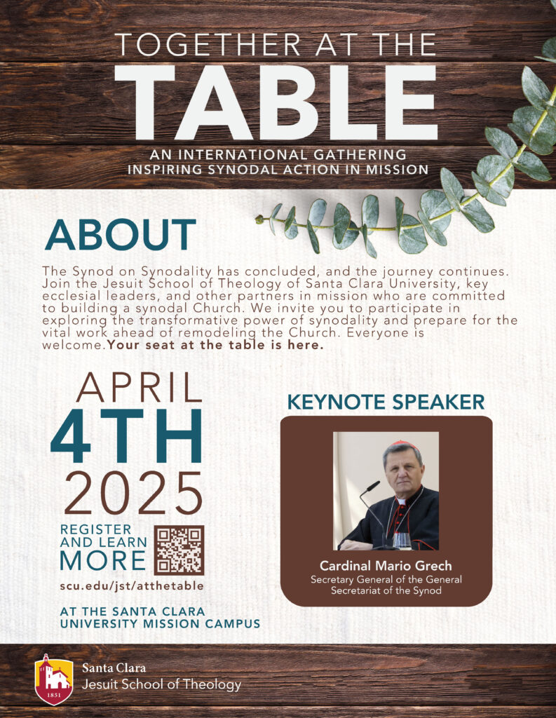 The Synod on Synodality has concluded, and the journey continues. Join the Jesuit School of Theology of Santa Clara University, key ecclesial leaders, and other partners in mission who are committed to building a synodal Church. We invite you to participate in exploring the transformative power of synodality and prepare for the vital work ahead of remodeling the Church. Everyone is welcome.Your seat at the table is here.