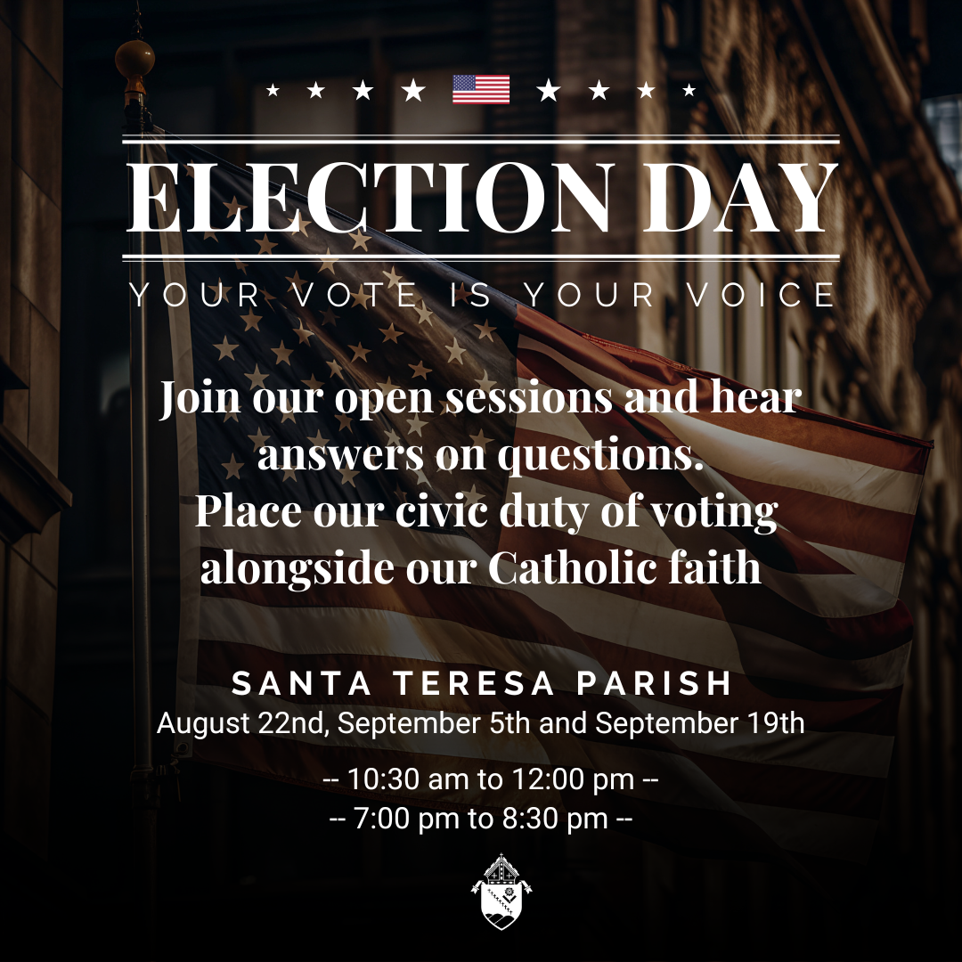 All sessions will be held inside Santa Teresa Church. There will be no endorsements of party, candidates or other issues. Sessions are offered mornings & evenings: 10:30am-12:00pm & 7:00-8:30pm.