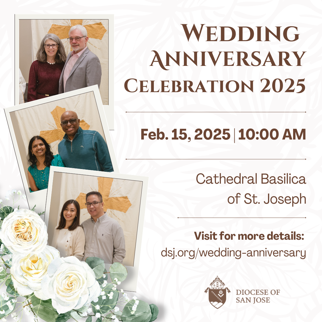 Couples celebrating their Wedding Anniversaries (1st – 5th, 25th, 40th, 50th, and greater) this year are invited to attend the celebration mass at the Cathedral Basilica of Saint Joseph in downtown San Jose.