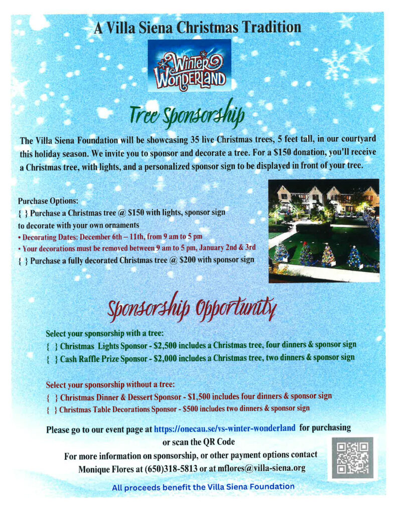 The Villa Siena Foundation will showcase 35 live Christmas trees, 5 feet tall, in our courtyard this holiday season. We invite you to sponsor and decorate a tree. For a $150 donation, you’ll receive a Christmas tree with lights. You bring your decorations, and we will display your tree in our courtyard with a personalized sponsor sign.