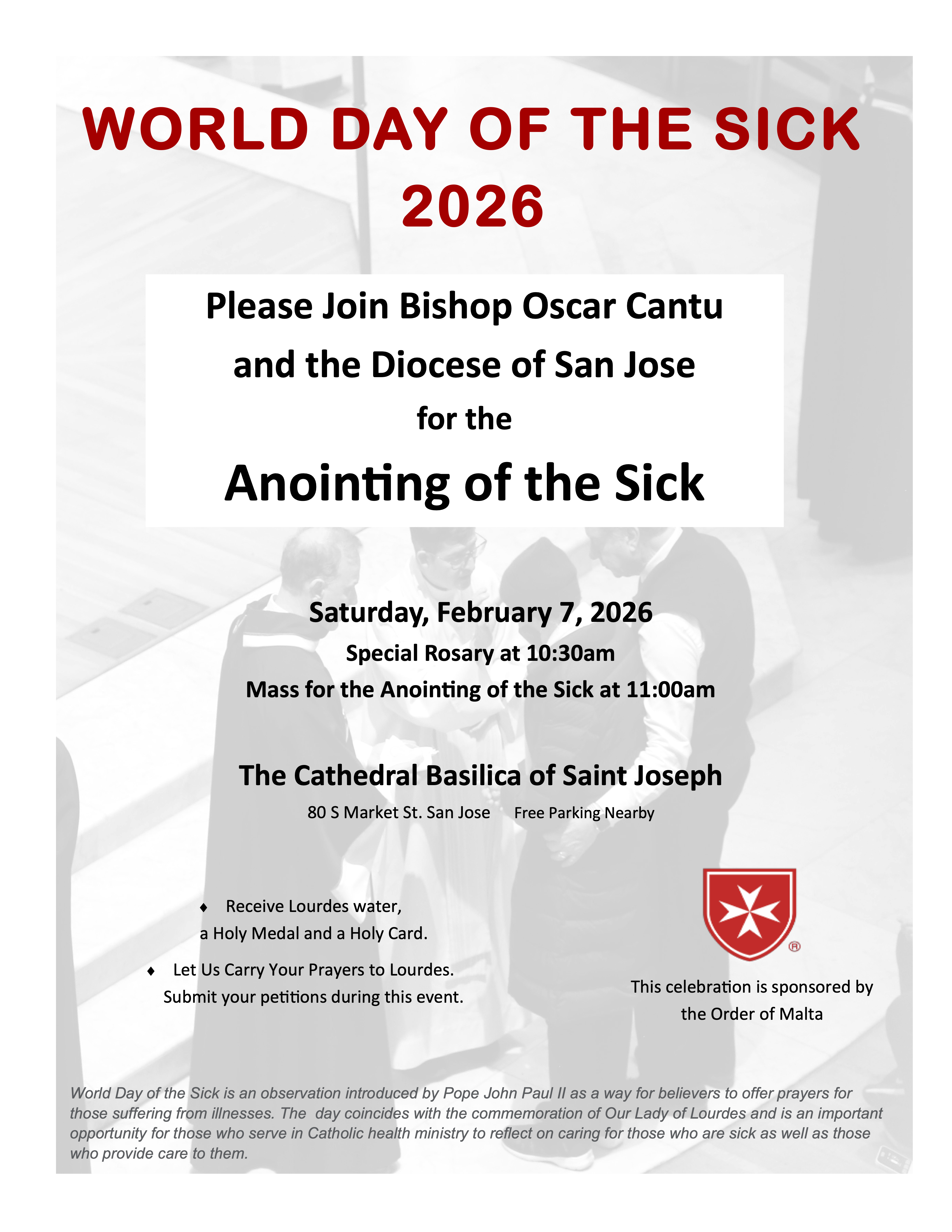 The Mass for the Sick at the Cathedral of San Jose on February 7, sponsored by the Order of Malta, will be celebrated by Bishop Oscar Cantu in honor of Our Lady of Lourdes and include an Anointing of the Sick, Blessing of Caregivers, distribution of Lourdes holy water and more. Prayer petitions will be hand carried to Lourdes in May 2025. A special rosary will precede Mass at 10:30am.