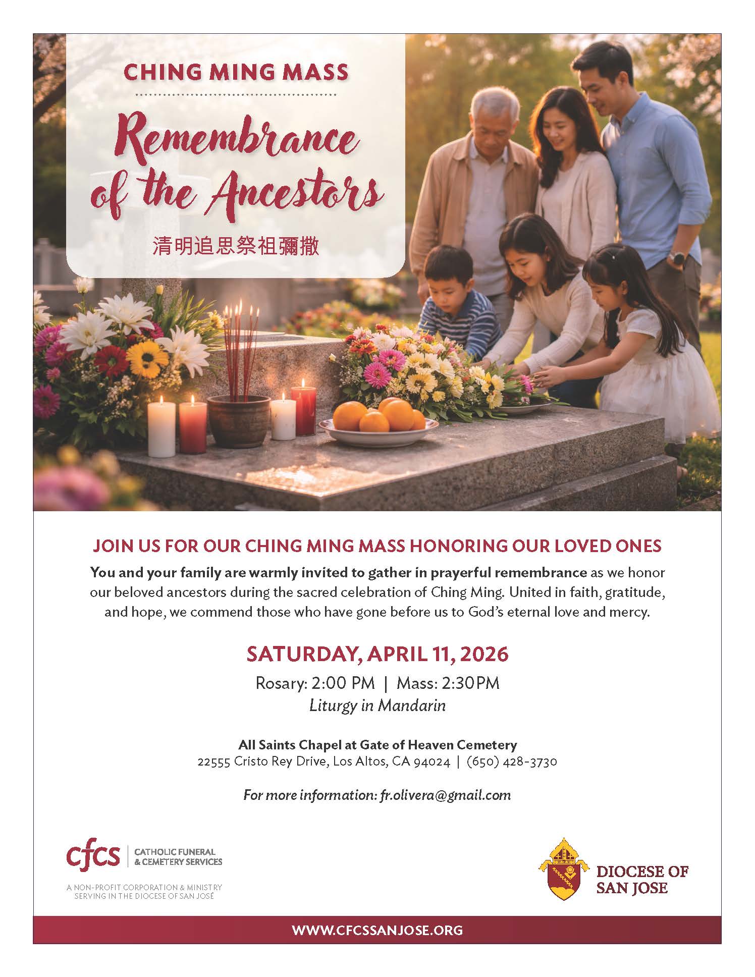 The faithful are invited to a special Ching Ming Memorial Mass honoring our beloved departed. Join us in prayerful remembrance as we gather in faith, gratitude, and hope to commemorate our ancestors during this sacred celebration. The event will take place on Saturday, April 11, 2026, beginning with the Rosary at 2:00 PM followed by Mass at 2:30 PM. The liturgy will be celebrated in Mandarin at the Chapel at Gate of Heaven Cemetery (22555 Cristo Rey Drive, Los Altos, CA 94024).
