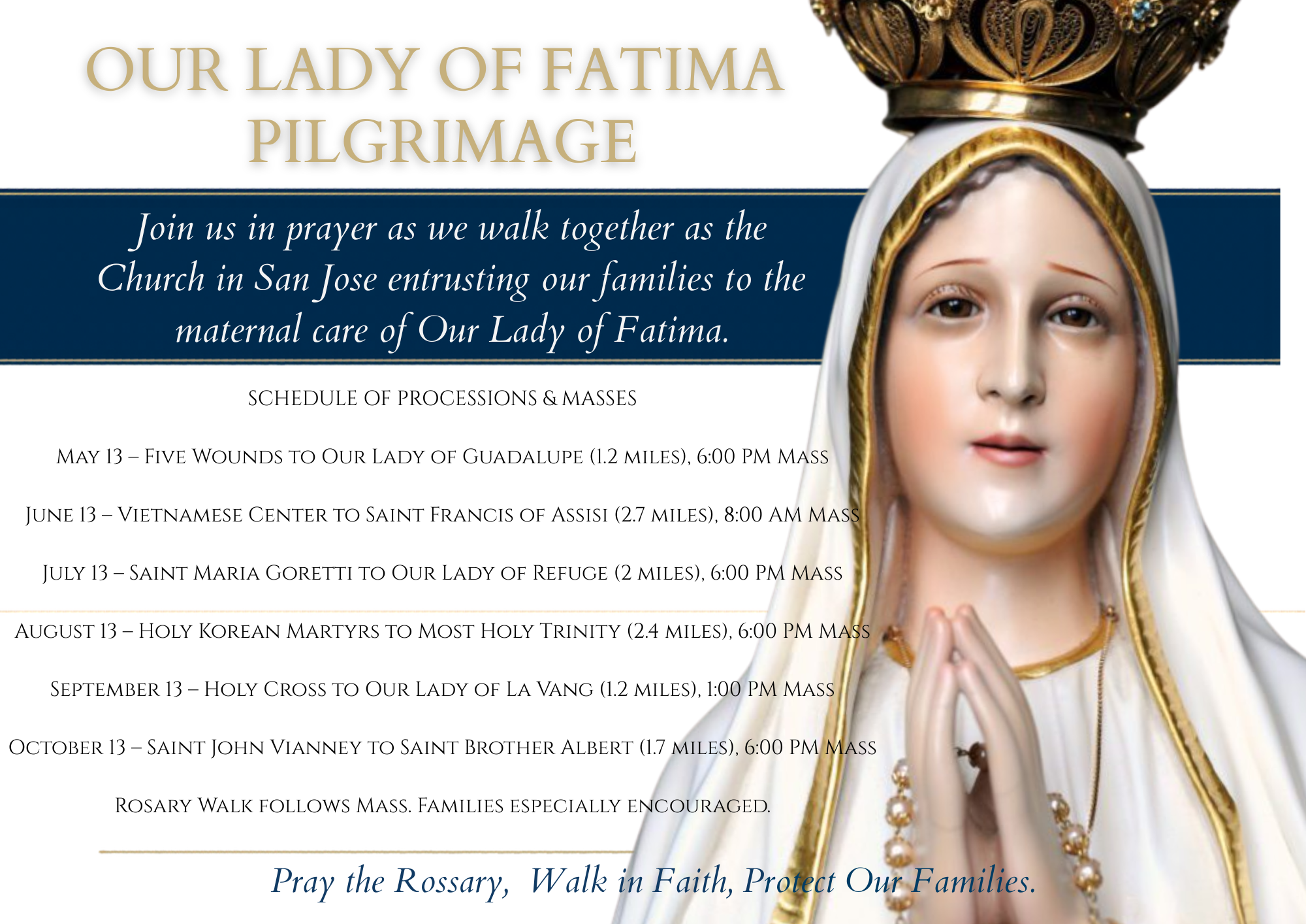Please join us in prayer as we walk together, as the Church in San Jose, entrusting our families to the maternal care of Our Lady of Fatima – The pilgrimage starts with the 1pm Mass and after will be the Rosary walk. Families are especially encouraged.